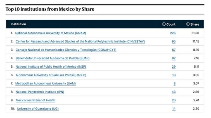 Entre las primeras 10 instituciones mexicanas se ubican el Centro de Investigación y de Estudios Avanzados (Cinvestav) en 2° lugar con 95 artículos y 11.15 de Participación; el Consejo Nacional de Humanidades, Ciencias y Tecnologías (CONAHCYT) en 3° lugar con 67 artículos y 8.79 de Participación; la Benemérita Universidad Autónoma de Puebla en 4° lugar con 82 artículos publicados y 7.16 de Participación; el Instituto Nacional de Salud Pública (INSP) en 5° lugar con 29 artículos y 5.11 de Participación; la Universidad Autónoma de San Luis Potosí (UASLP) en 6° lugar con 13 artículos y 3.55 de Participación; la Universidad Autónoma Metropolitana (UAM) en 7° lugar con 8 artículos y 3.07 de Participación; el Instituto Politécnico Nacional (IPN) en 8° lugar con 43 artículos y 2.86 de Participación; la Secretaría de Salud en 9° lugar con 26 artículos y 2.41 de Participación; y la Universidad de Guanajuato en 10° lugar con 14 artículos y Participación de 2.30 de Participación.