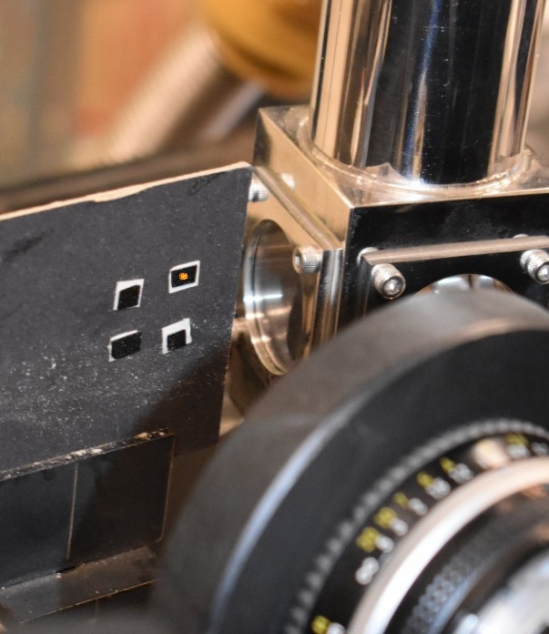 Substrato para Crecimiento Epitaxial: Se muestra la cámara de introducción de substratos al sistema de crecimiento epitaxial. Sobre un cilindro de molibdeno (portasustratos) se puede observar el substrato de muy alta calidad cristalina que refleja la luz como un espejo.